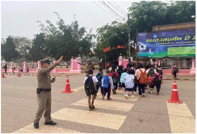 มอบหมายให้ ชุดจราจร อำนวยความสะดวกการจราจรหน้าโรงเรียนอนุบาลด่านซ้าย
