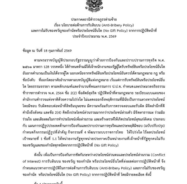 สถานีตำรวจภูธรด่านซ้าย ประกาศเจตนารมณ์ที่จะไม่รับของขวัญ(No Gift Policy) ณ วันที่ 18 กุมภาพันธ์ 2569